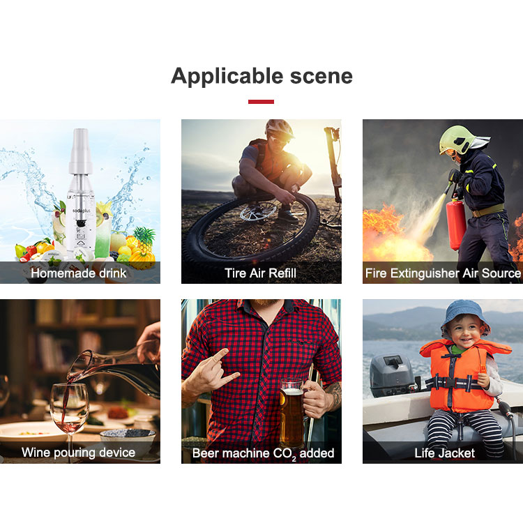 युनिभर्सल कम्प्याटिबिलिटी - कुनै पनि स्पार्कलिंग वाटर डिस्पेन्सर वा कार्बोनेशन मेसिनसँग मानक 3g CO2 कारतूसहरू प्रयोग गरी काम गर्दछ, जस्तै ICO सोडा सिफन र अन्य स्पार्कलिंग वाटर डिस्पेन्सरहरू र बजारमा केही अन्य सोडा डिस्पेन्सरहरू सहित घर बनाउने किटहरू। Drinkmate CO2 कारतूस, Mosa, Liss, Leland र अन्य CO2 चार्जरहरूसँग तुलना गर्न सकिन्छ।